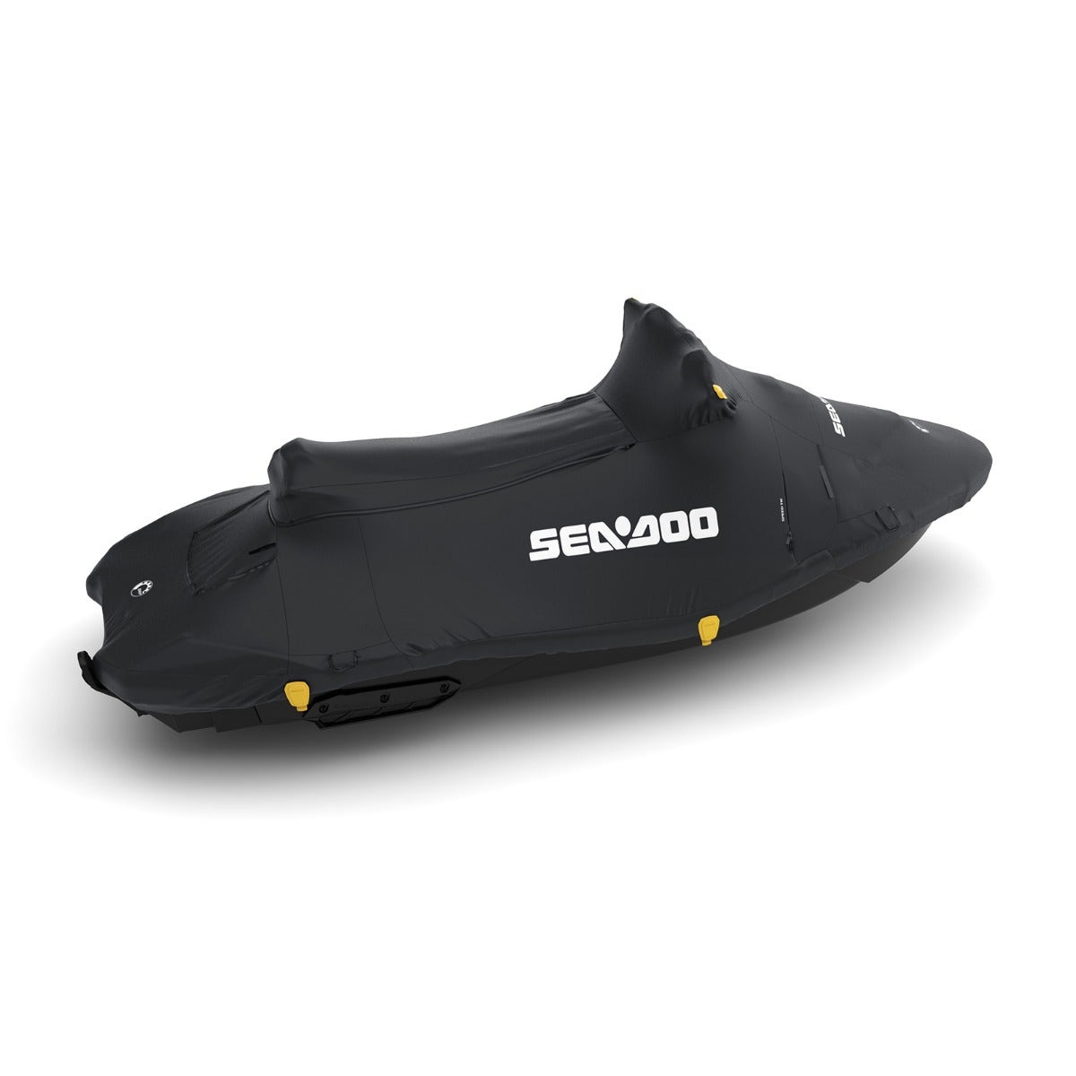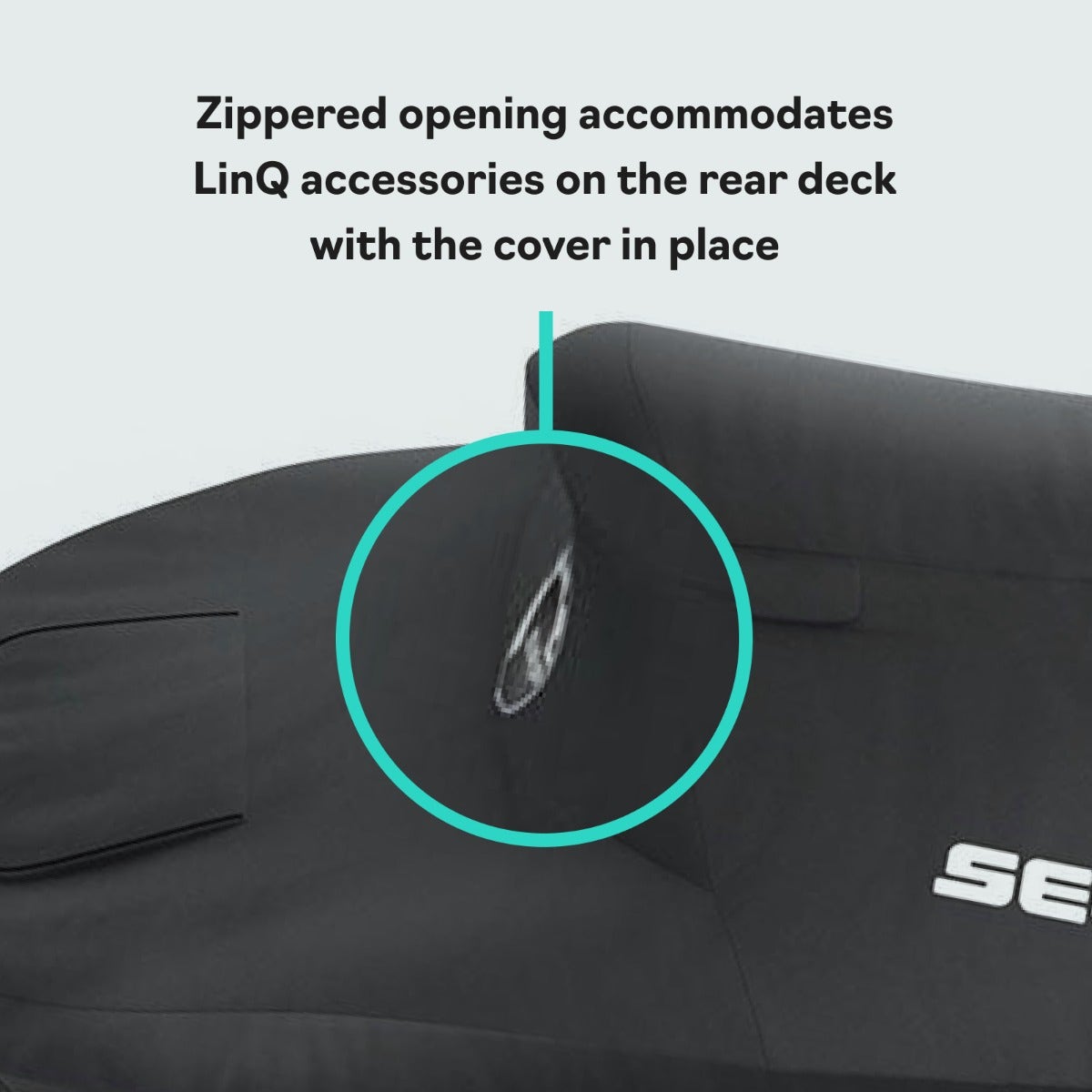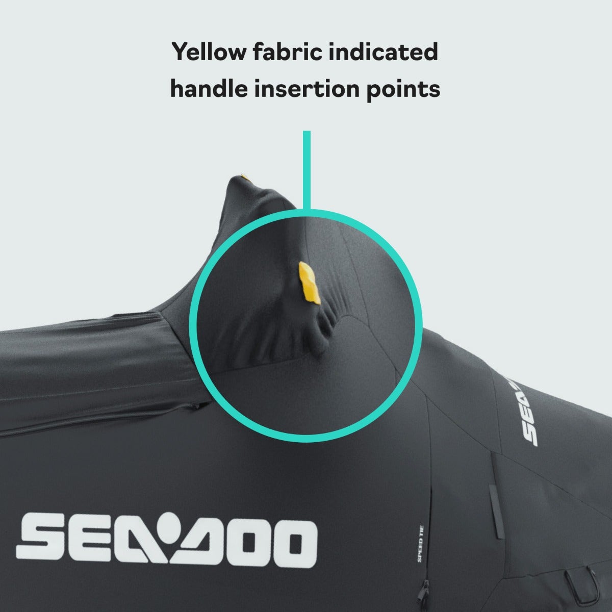 Constructed of heavy-duty and UV resistant polyester canvas fabrics, this cover is also reinforced with a double layer in high wear areas and features easy zippered access to everything including mooring cleats, The Speed Tie System, LinQ Lite Fender mounts and LinQ accessories on the back deck. Plus there's yellow fabric indicators for the handlebars, making installation easier and the soft inner liner helps protect the finish of your watercraft. Weather-resistant cover protects your watercraft during storage and trailering. Made of heavy-duty UV-resistant solution-dyed polyester canvas. Yellow fabric indicates handlebar position points. Zippered openings allow easy access to: - mooring cleats. - LinQ accessories on the rear deck (with the cover on) - Glove box - Front storage - Refueling - Tie-downs for securing covered watercraft on a trailer. Soft inner lining prevents panel abrasion. High wear areas reinforced with a double layer of canvas. Patented air release vent system for trailering. Side hooks secure the cover while trailering.