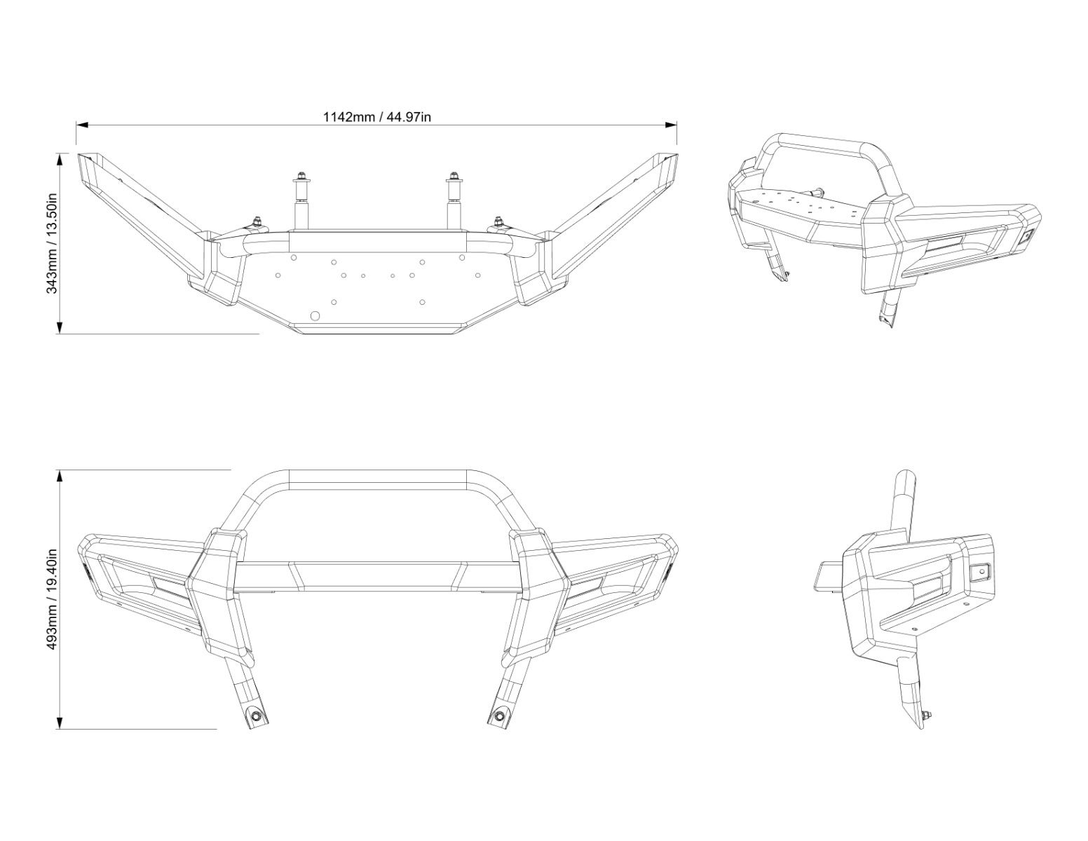 This robust front bumper is designed for heavy-duty performance, featuring a durable construction made from 1.5-inch (3.8 cm) diameter steel tubing. It offers exceptional protection for your vehicle, ensuring it can withstand tough conditions. The Large Heavy-Duty Front Bumper is treated with an anti-corrosion coating on both the inside and outside, complemented by a resilient powder coat finish that enhances longevity and aesthetic appeal. This combination of materials and finishes makes it a reliable choice for those seeking durability and strength in their vehicle accessories. 1.5” (3.8 cm) diameter steel-tube construction. Provides heavy-duty protection. Inside and outside anti-corrosion coating with durable powder coat finish. Integrated mounting point for SMART 10'' (25 cm) LED Light Bar (715008745). Standard on all LoneStar and Limited Cab models.