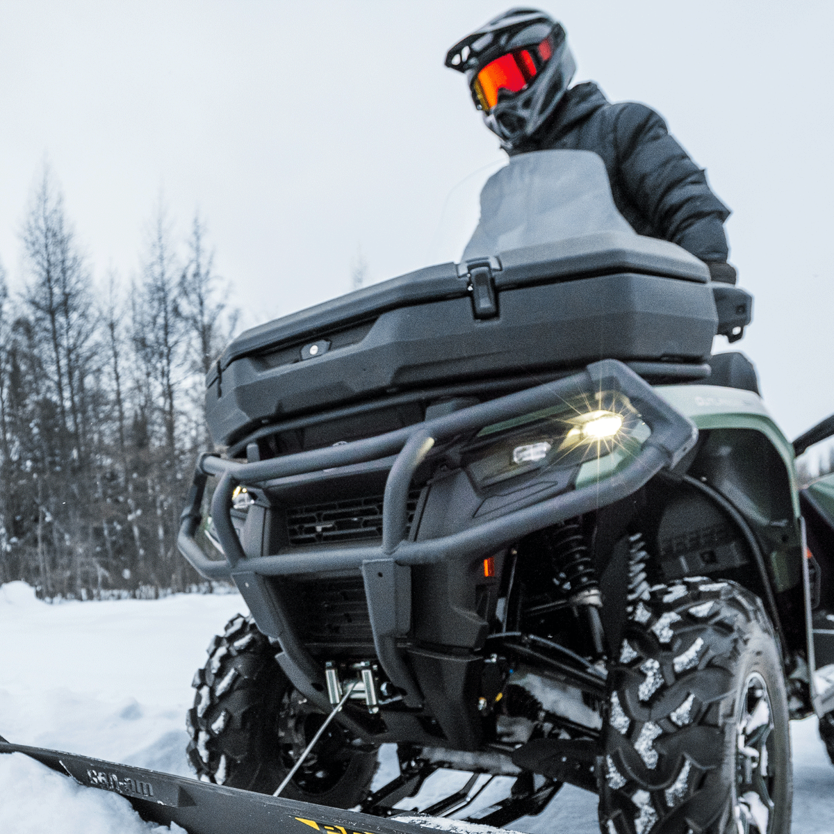 Explore the outdoors and take everything along for the ride! The LinQ 30 US Gal (139 L) Trunk Box is an easy-to-use storage solution that’ll seamlessly elevate your Can-Am Outlander adventures. With a polyethylene shell and impressive storage capacity, it makes for the perfect replacement for your ride’s rear rack. Designed for easy installation and removal, this LinQ accessory is completely hassle-free. Featuring four LinQ anchors and an ergonomic latch system for superior sealing, it knows how to keep your cargo secure. It even comes with an option to install LinQ 16” accessories on the cover, so you can customize your storage even further. Lock it up with the included keys and head out there with confidence, knowing your gear is safe and sound. Compatible with passenger seat. Polyethylene Trunk Box replaces the rear rack for perfect integration and to increase cargo capacity. Storage capacity of 30 Gal (139 L). Easy to install and remove with the new updated LinQ system. LinQ anchors must be installed in the rear cargo compartment (4 LinQ anchors included). Compatible with the passenger seat. New ergonomic and resistant latch system offers excellent sealing. Ability to install LinQ Tool Holders (715008896) on the box. Lockable with a lock on the front of the box (two keys included). Requires LinQ Base Installation Kit 860201806 for installation included with the accessory.