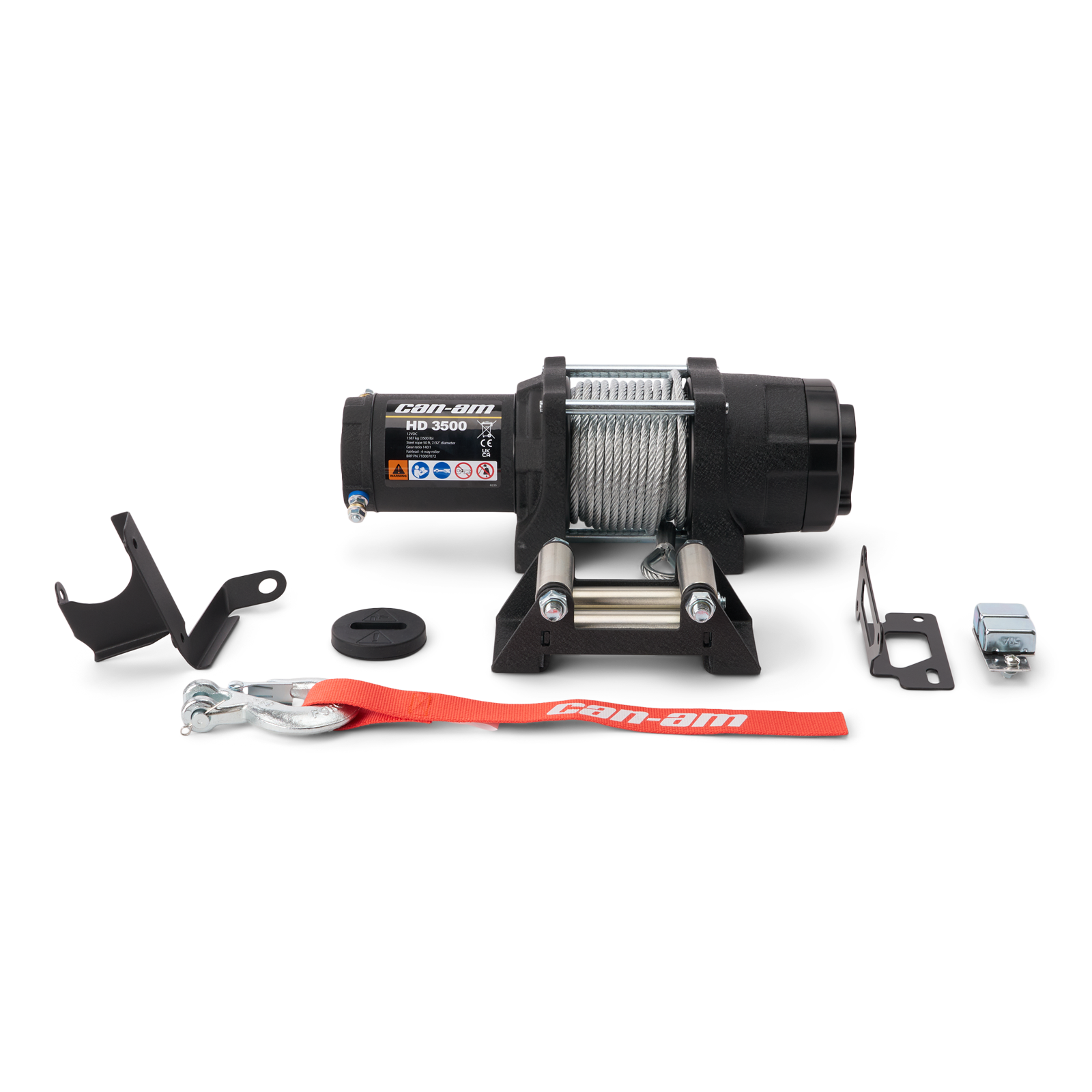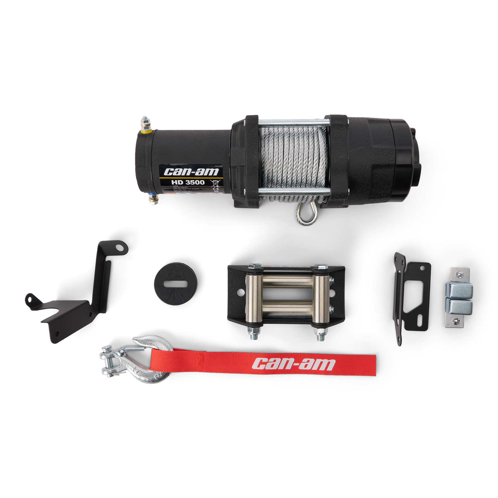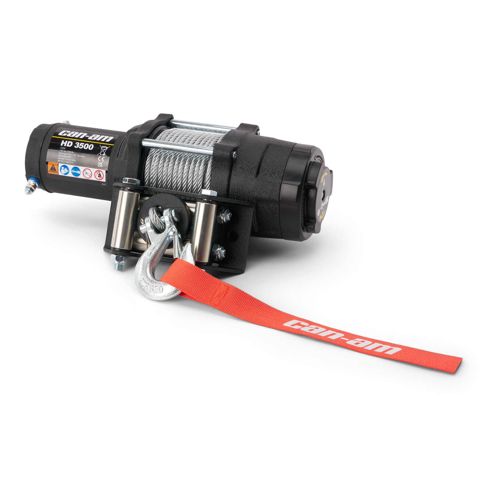 Prepare for any situation with the Can-Am Winch series. the ATV specific 3500lbs winch can pull loads or help move the vehicle across difficult terrain. The high quality components help deliver the required torque in all conditions. Ergonomic clutch handle. Rugged all-steel gears and bushings, provides more torque and longer life. Automatic 100% load-holding brake. Corded 10 ft. (3m) weather sealed wired remote control (sold separately). Pulling strength capability of 3,500 lb (1,588 kg). 50 ft. of 7/32” (15.2 m of 5.4 mm) wire steel cable. Heavy-duty 4-way roller fairlead. EC Compliant.