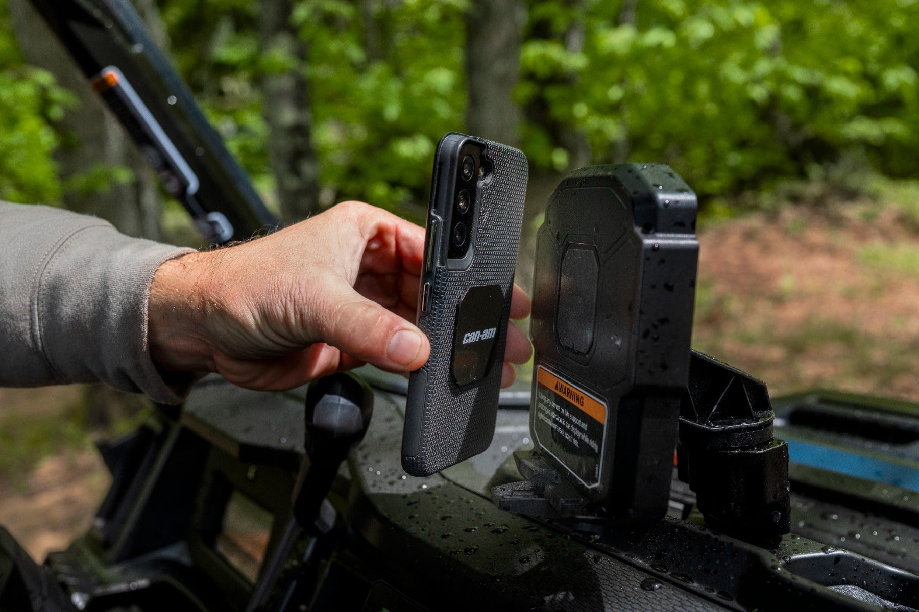 Challenging terrain ahead? The LinQ Lite Device Holder is ready to keep your electronic devices securely mounted, no matter how rough the ride gets. Featuring powerful magnets, this holder ensures your smartphone, GPS or other gadgets stay firmly in place while off-roading. The package comes complete with two pre-assembled Can-Am plates equipped with 3M multi-surface adhesive, making installation straightforward and reliable on a variety of device surfaces. The 360-degree adjustable rotation feature gives you the flexibility to position your device at the perfect angle, improving visibility and interaction while riding. And thanks to the innovative LinQ Lite attachment system, you can quickly attach or detach the holder in seconds for ultimate convenience. Made with strong magnets that you can trust while riding through rough terrain. Includes everything needed for installation on your favorite electronic devices: 2 pre-assembled Can-Am plates with 3M multi-surface adhesive. 360° adjustment for an improved driving experience and immersion. Secure LinQ Lite attachment allows you to install/remove the holder in seconds. Robust plastic and aluminum construction allows for the right fit and easy installation. Compatible with the Cellphone Holder (715008786). Defender G2: Holds most tablets and smartphones measuring between 5.1" (13 cm) and 10" (25.4 cm) (with protective case). Maverick R & X3: To keep a good vision while driving, we recommend using this device for smartphones only.