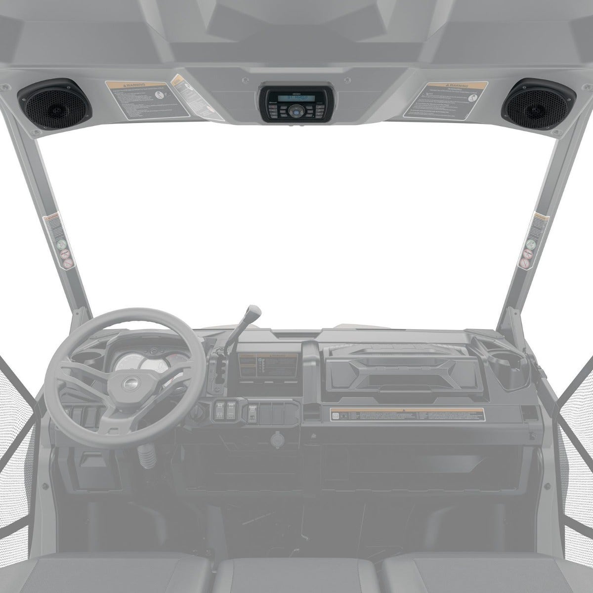 Enhance your riding with the complete overhead audio, the cage mounted speakers powered by an integrated head unit will provide the perfect soundtrack for any ride. Listen to AM, FM or connect any music playing device. Audio System Rugged waterproof Jensen† Bluetooth Stereo Audio system Stream from any Bluetooth-enabled device (smartphone, mp3 player). Powerful 4x40W amplifier with remote turn-on. Separate RCA audio output and input. Complete with 2 ultra-sturdy front outdoor speakers and black speaker box. 30 programmable AM/FM stations with auto-store/pre-set scan. Lighting & Control Convenient white LED-backlit LCD display and buttons. Voice-control of AVRCP-active device. Design & Durability UV-resistant finish / corrosion-resistant components. Compatibility Requires Sport Roof (715002430 (except on XT and Mossy Oak Hunting Edition models)), Front Roof Liner (715003098) or Deluxe Sport Roof (715002511) and Power Cable (715003094 (except if you already have a Hard Cab Enclosure (715001966 or 715003482)).