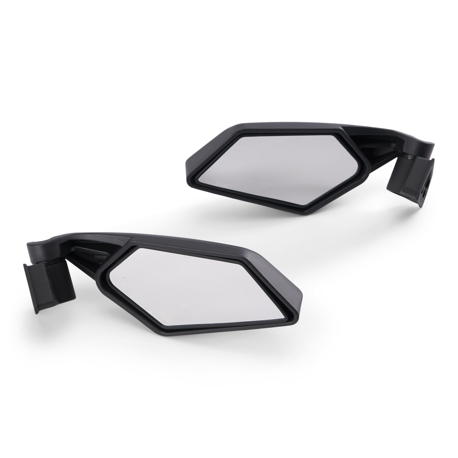 Add a pair of Can-Am racing side mirrors, located on the top of the roll cage to provide maximum visibility. These side mirrors have dedicated mounting locations for the easiest of installation. Their flat optic visibility reflect true to life visibility optimal to judge distances. The adjustable panel and the pivoting joint allow riders to fine tune their point of view, while being able to flip them for trailering, but never losing the desired adjustment. Race-inspired design features rugged black nylon 6/6 construction with coated cast-aluminum mount. Dual-adjustment provides optimal field of view (FOV). Multi-position adjustable ball-joint mounted mirrors. Flat optics deliver improved distance perception. Spring-loaded pivots let mirrors fold back completely. Not compatible with Lonestar Racing Light Racks and Upper Soft Door Panels. Sold in pairs.