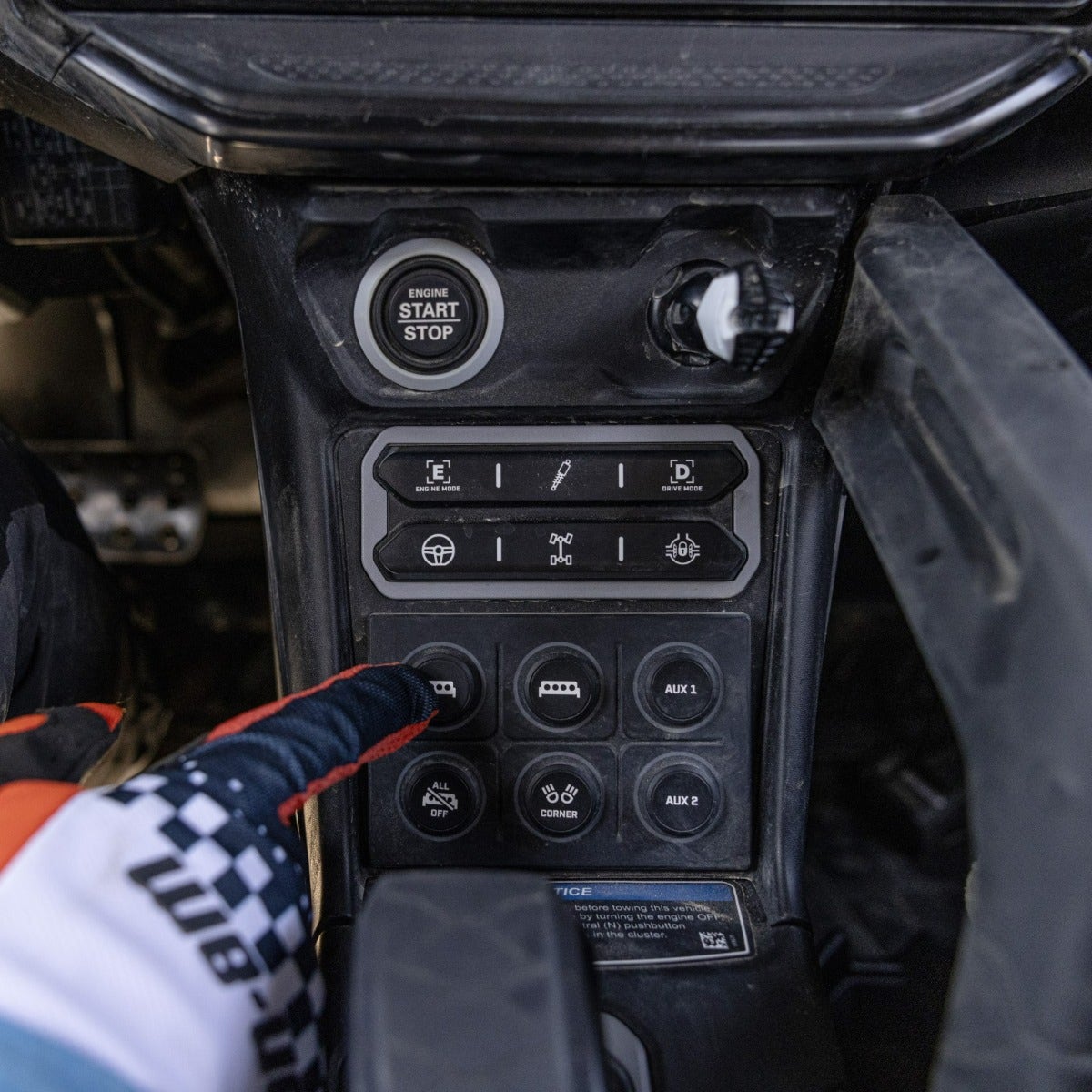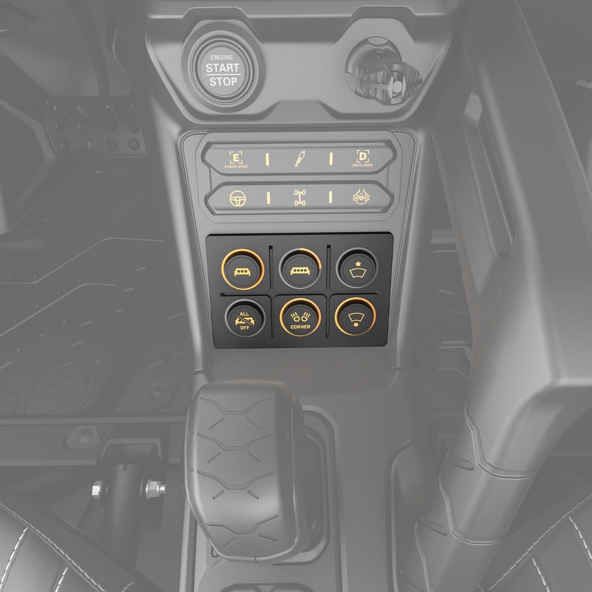 Keep your eyes on the trail ahead with the SMART Control Center for ACM and its quick access buttons. Control your accessories without looking down and focus your attention on what matters most: the road ahead and the thrills you're chasing! Control the accessories with the selection of different modes, the illuminated halo around the button indicates the active mode. Icons illuminate when accessories are activated. Make accessory control changes without having to take your eyes off the trail by choosing the accessory button required (quick access). All Front LED Off button to turn off all front lights with one click. Remembers the last programmed setups when this button is pressed again. 6 pre-programmed buttons and 8 programmable buttons to customize according to the accessories installed.