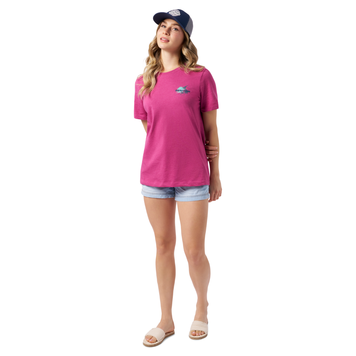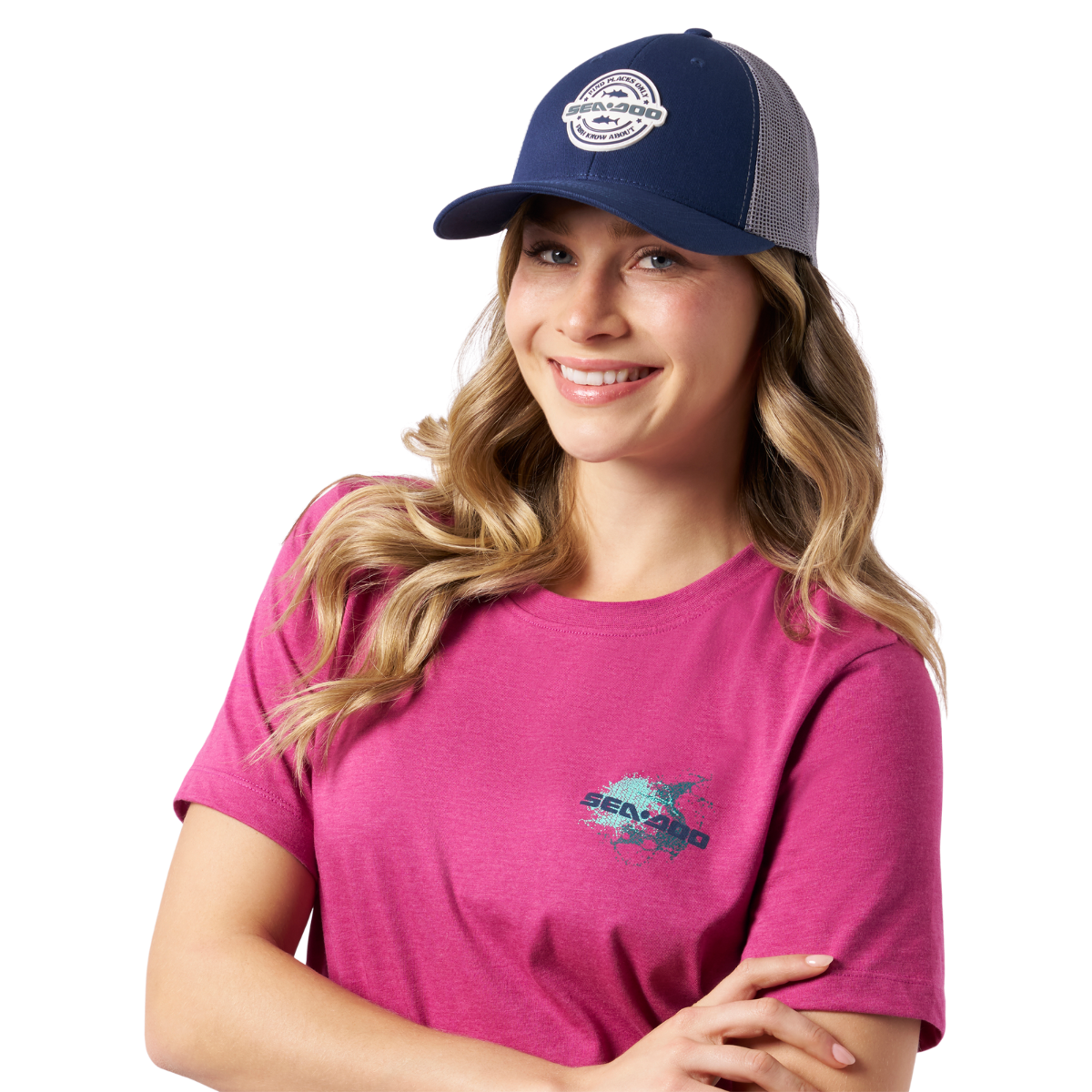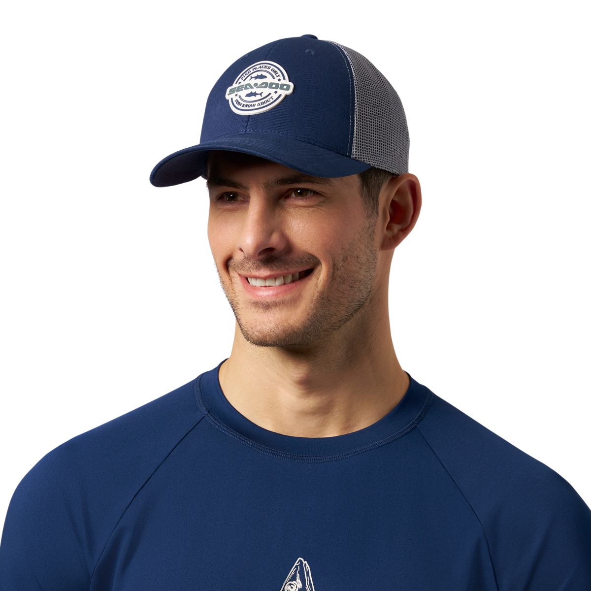 Stay cool and stylish with the Sea-Doo Fishing Mesh Cap, featuring a solid color design with contrasting mesh panel, an embroidered fishing-inspired patch, and an adjustable snapback closure for a perfect fit. Made from 100% cotton for comfort. Content: 100% Cotton. Solid colored cap with contrasting Mesh Panel. Fishing inspired patch embroidered at front. Snapback closure at back.