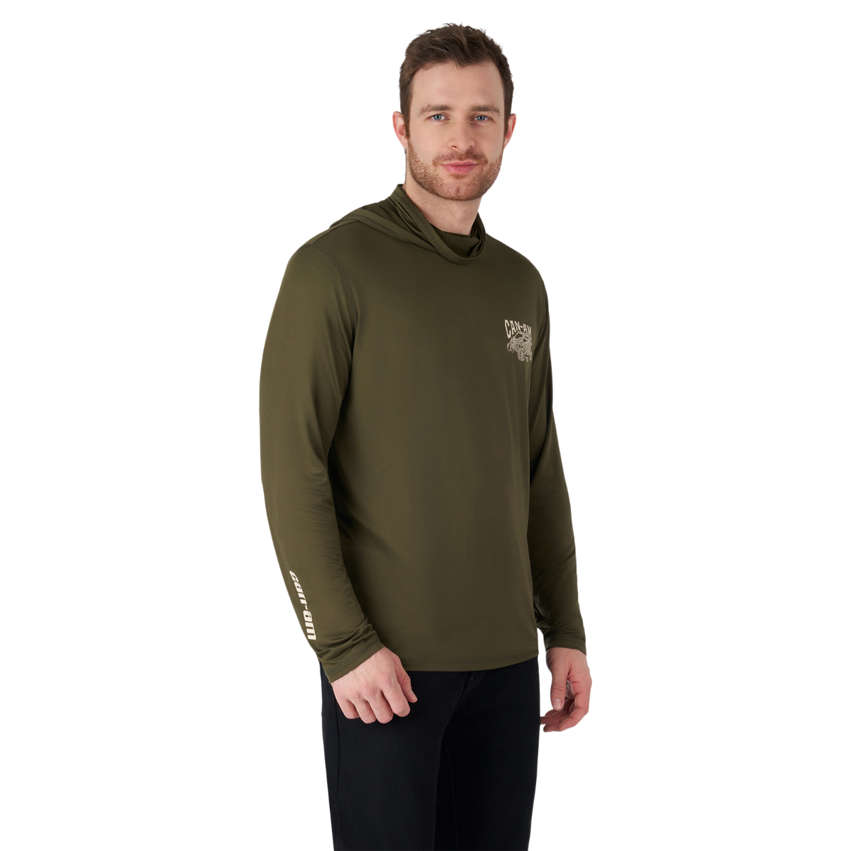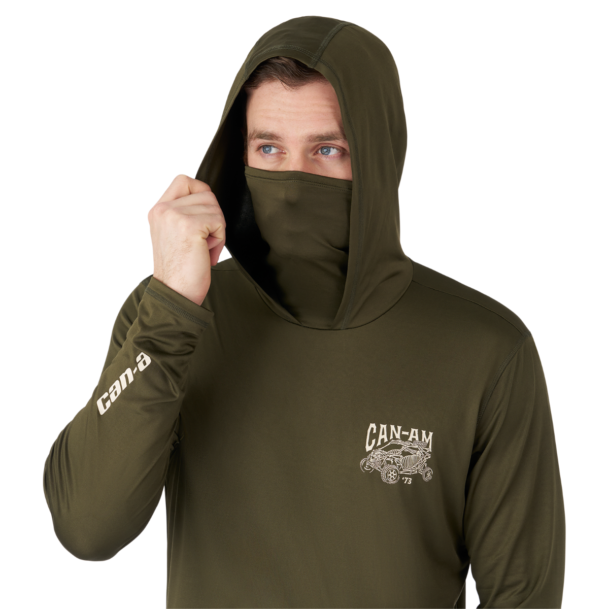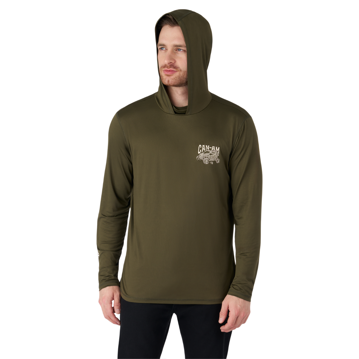 92% polyester, 8% spandex. 175 gsm. Loose fit. UV protection – 50 UPF. Quick dry. Built-in gaiter mask. Can-Am logo on the right sleeve and artwork at left chest.