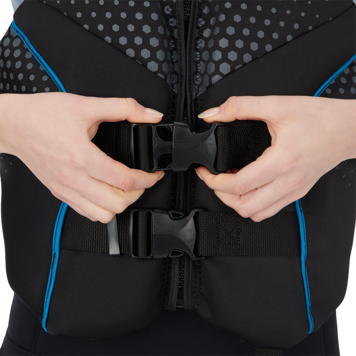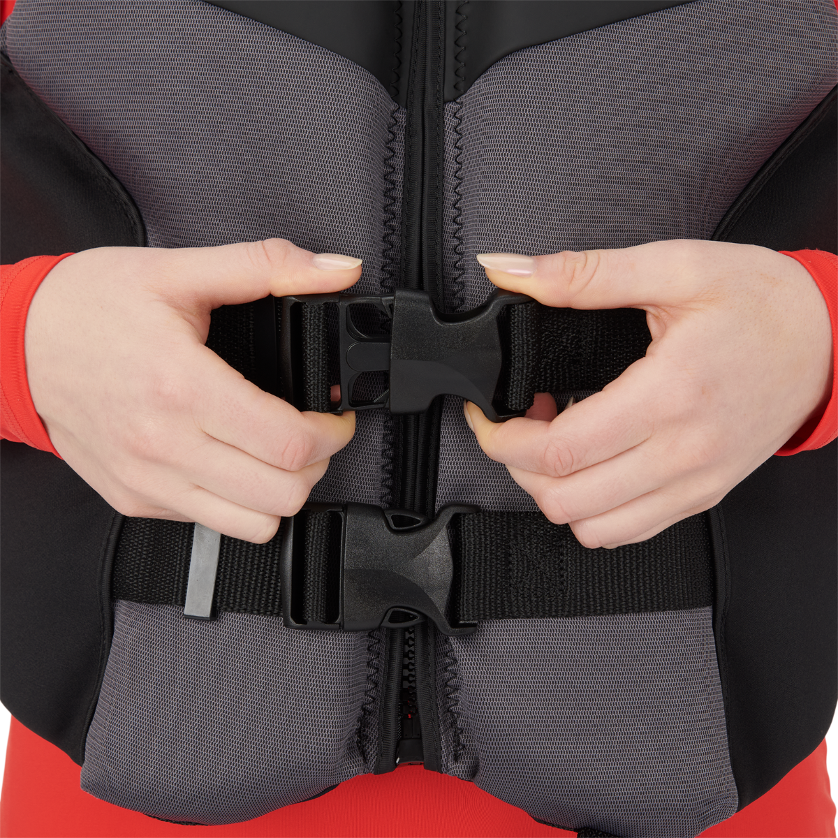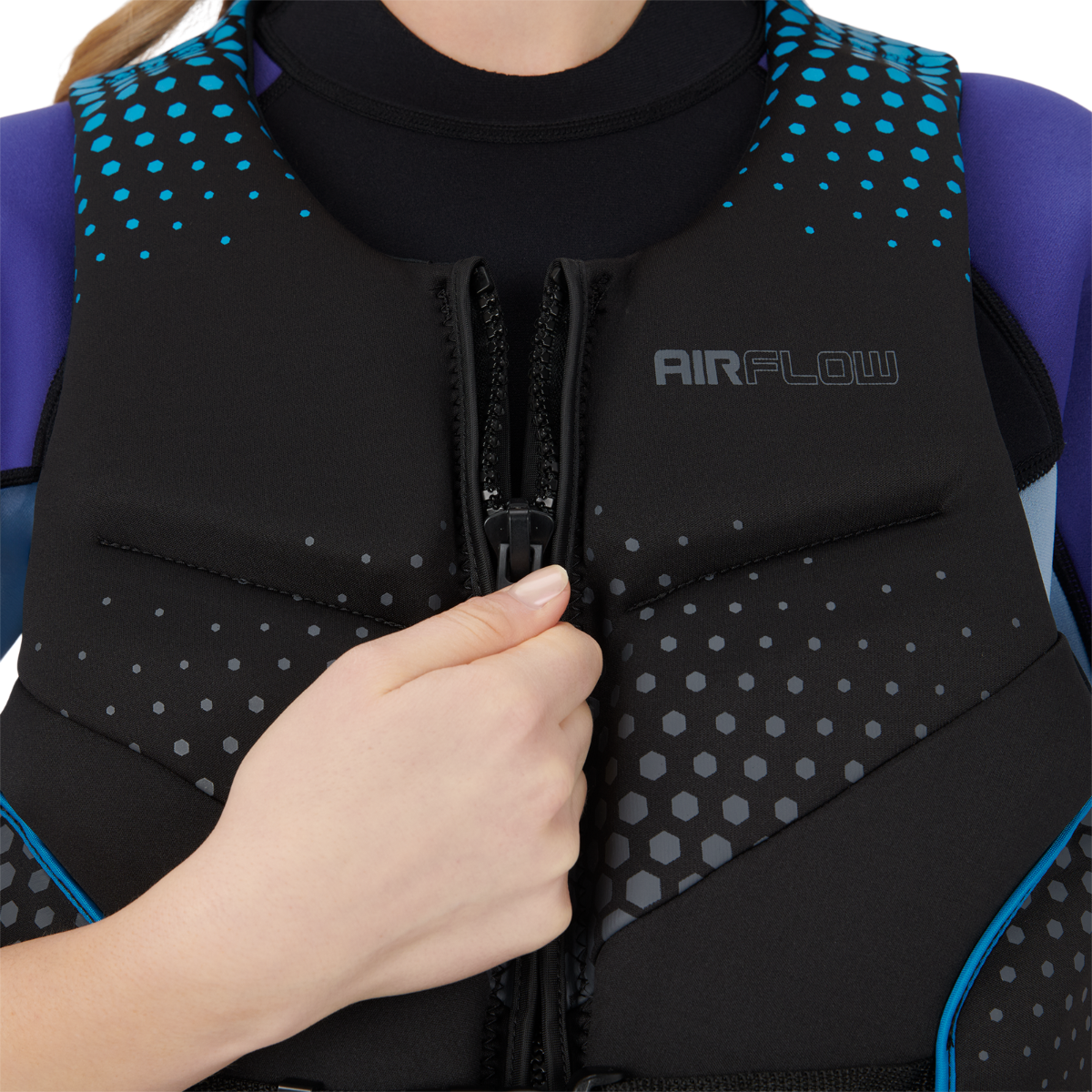 Breathe easy in the ultra-light Sea-Doo Airflow PFD Life Jacket. With eco-conscious materials like 100% PVC-free Gaia foam and rubber-free ecoprene, this PWC Life Jacket is an environmentally-friendly option for water-lovers. Built with an interior EVA molding Airflow System, and mesh panel, this jacket is kept away from the skin for ventilation and dries quickly. Your lower back gets extra support in the form of the comfort zone added padding, while the side stretch panels and enhanced armholes allow you to move freely. The sizes shown on this page are men's sizes. Environmentally friendly ecoprene material that is rubber free, flexible, lightweight, breathable and quick dry. Vest interior constructed of eco-friendly 100% PVC-free Gaia foam. AIRFLOW SYSTEM: Interior EVA molding that keeps the life jackets surface away from the skin. LUMBAR COMFORT ZONE: Extra foam padding to minimize the pressure on your lower back while bolstering support. MESH PANEL: Drain away excess water for quick drying and thermal regulated comfort. Comfortable fit. YKK front zipper. Side panels in stretch lining fabric for improved comfort. Armholes cut large for riding comfort. Loop at back neck to attach your goggles to your vest. D-ring for key lanyard. Coast Guard approved. Shell: 100% Polyester Insulation: 100% Gaia Foam