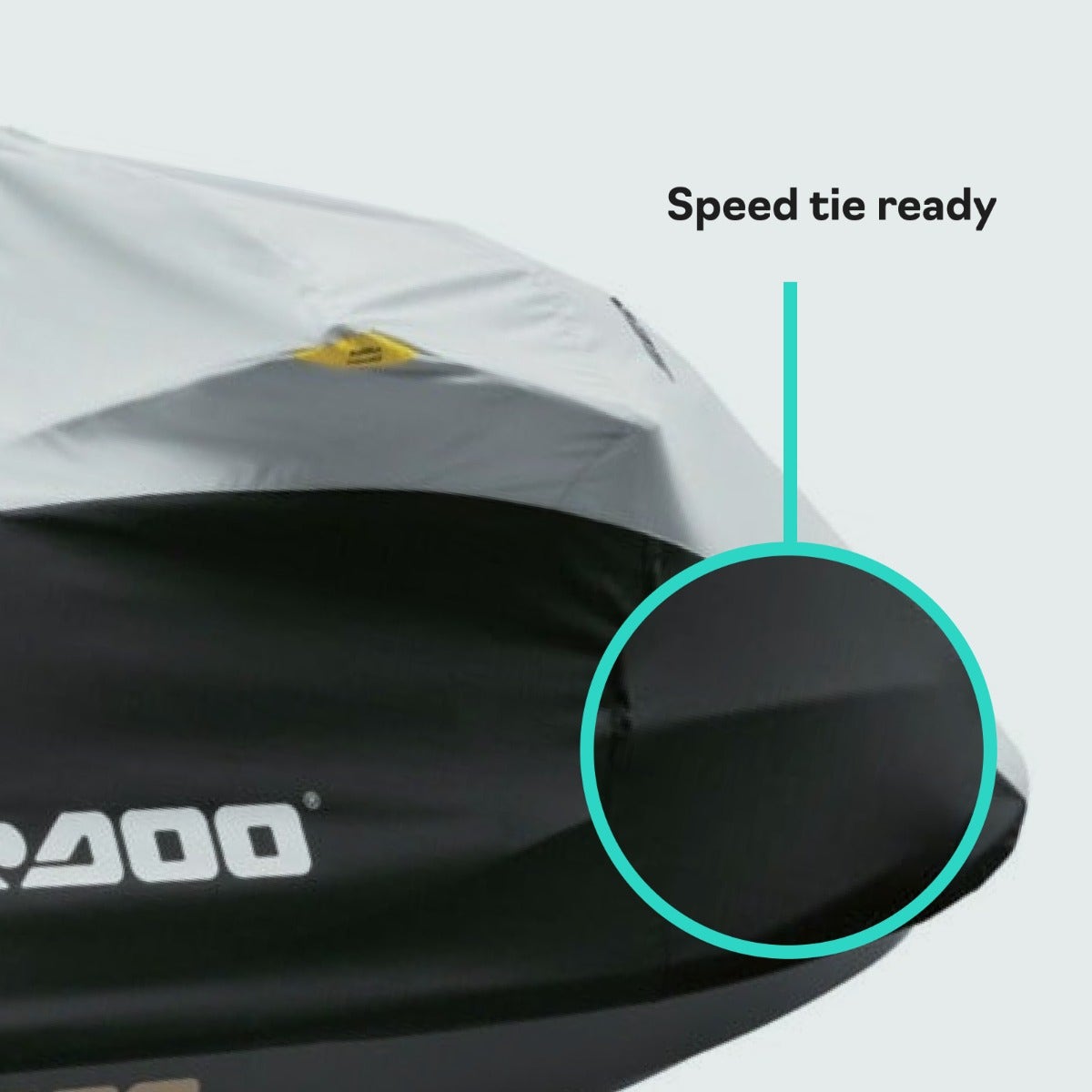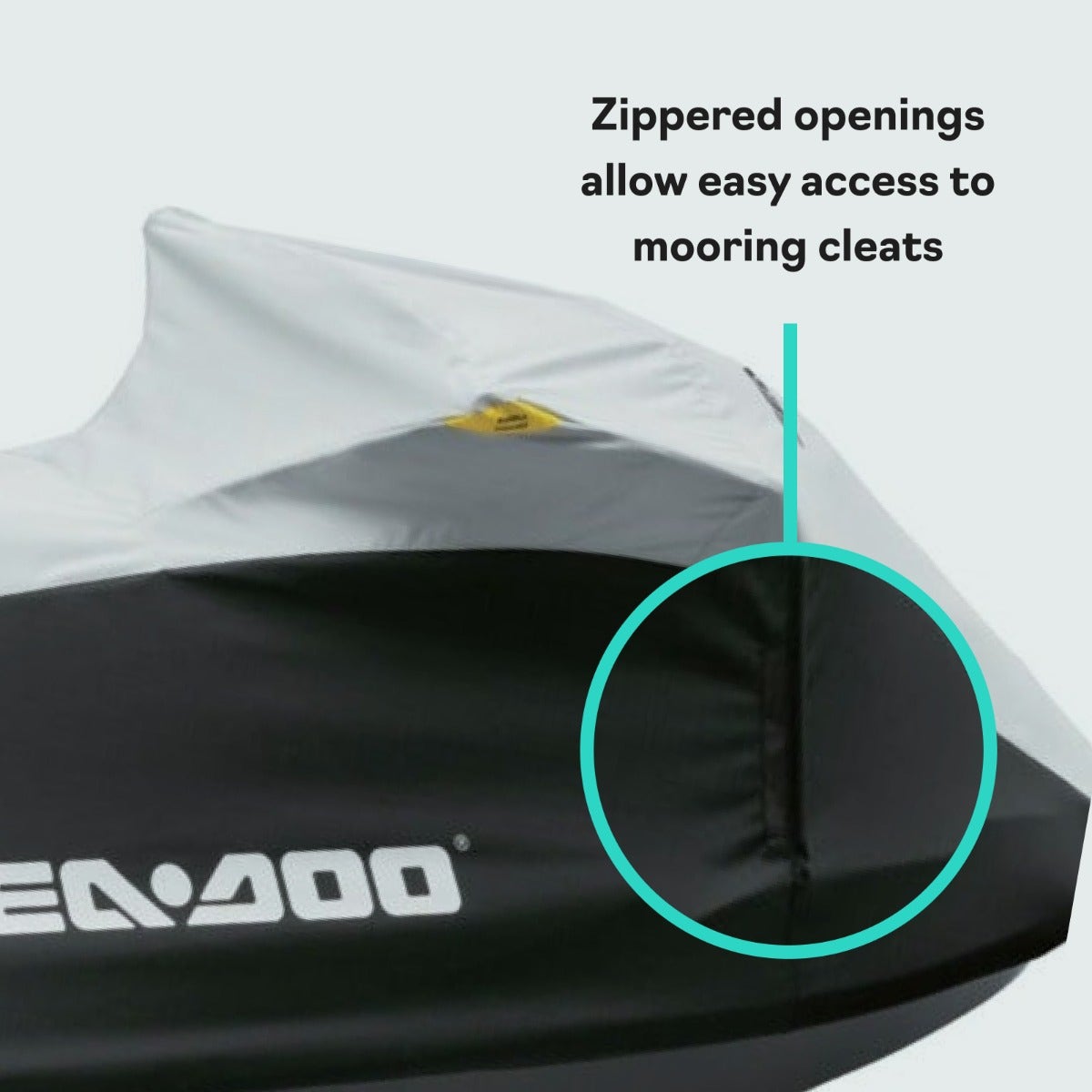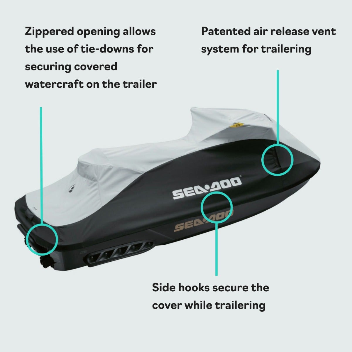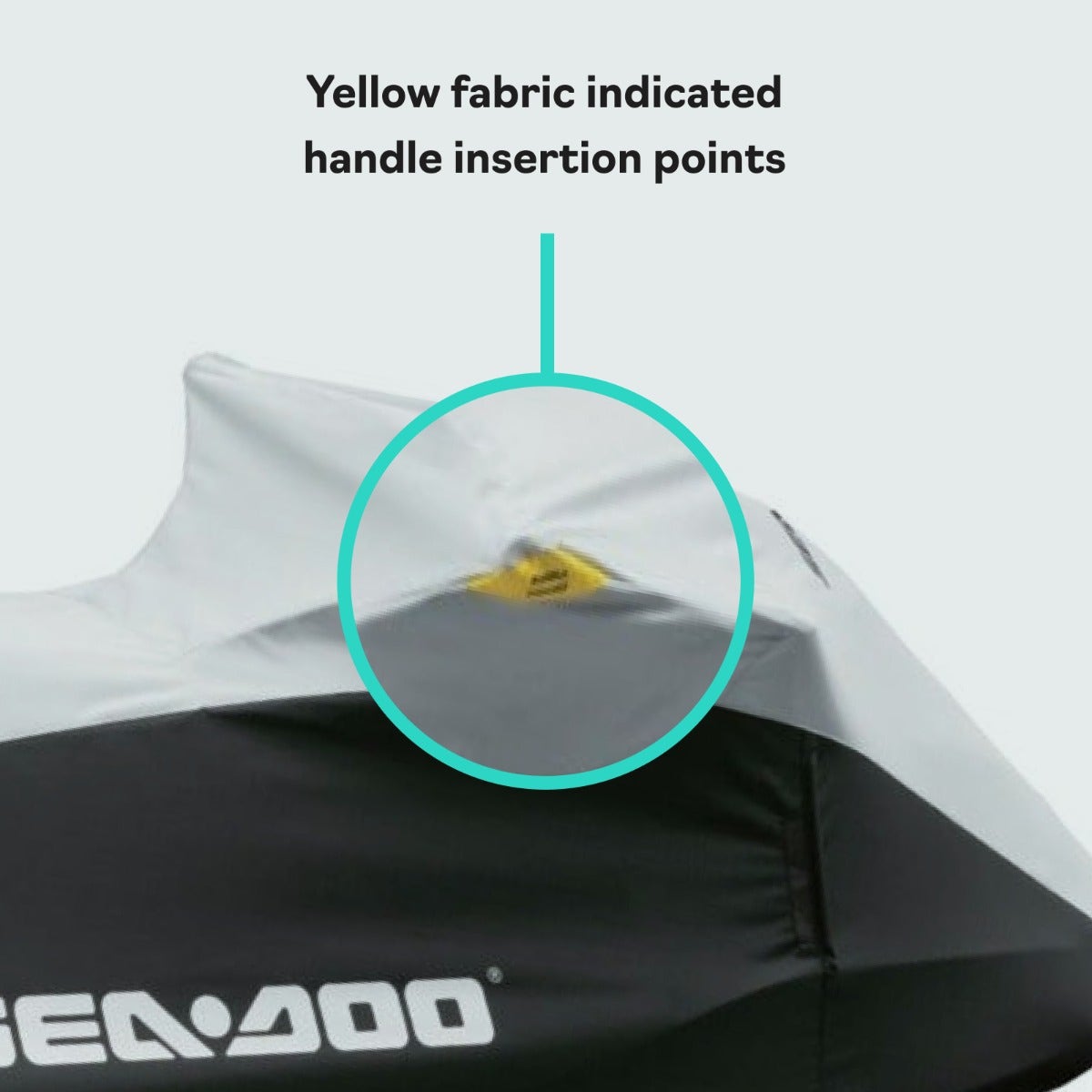 Safeguard your Sea-Doo GTR watercraft with a reliable and durable trailering 2018 GTR cover. Crafted from heavy-duty UV-resistant solution-dyed polyester canvas, the weather-resistant Sea-Doo GTR Cover offers exceptional protection during storage and transportation. Soft inner lining prevents panel abrasion, preserving the pristine condition of your watercraft. Zippered openings allow easy access to mooring cleats, ensuring hassle-free usage. To enhance durability, areas prone to higher wear are reinforced with a layer of double canvas. It's perfect to keep your watercraft safe and ready to hit the waves! Weather-resistant trailering cover protects your watercraft during storage and transportation. Made of heavy-duty UV-resistant solution-dyed polyester canvas. Soft inner lining prevents panel abrasion. Yellow fabric indicates handle insertion points. Zippered openings allow easy access to mooring cleats. Areas prone to higher wear are reinforced with a layer of double canvas. A perfect fit for your watercraft, with or without installed Sea-Doo accessories. Side hooks secure the cover while trailering. Patented air release vent system for trailering.