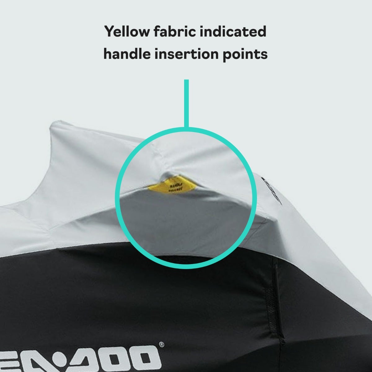 Experience ultimate protection for your Sea-Doo watercraft during storage and transportation with the reliable Sea-Doo GTX and RXT cover. Crafted from heavy-duty UV-resistant polyester canvas, this weather-resistant trailering Sea-Doo cover 2017 keeps your watercraft safe from the elements. All features on this cover gives the power of convenience at your fingertips: the yellow fabric highlights handle insertion points and zippered openings provide easy access to mooring cleats. Safeguarding your PWC during the storage or transportation of your Sea-Doo watercraft is now easier than ever. Weather-resistant trailering cover protects your watercraft during storage and transportation. Made of heavy-duty UV-resistant solution-dyed polyester canvas. Soft inner lining prevents panel abrasion. Yellow fabric indicates handle insertion points. Zippered openings allow easy access to mooring cleats. Areas prone to higher wear are reinforced with a layer of double canvas. A perfect fit for your watercraft, with or without installed Sea-Doo accessories. Side hooks secure the cover while trailering. Patented air release vent system for trailering. Standard on GTX LTD models.