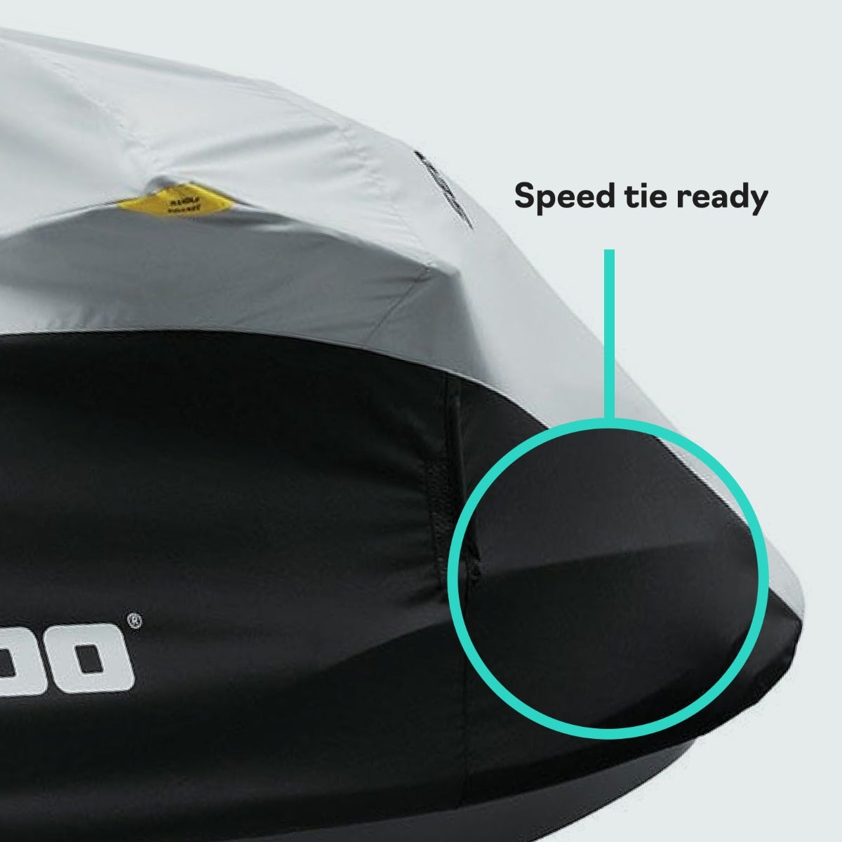Introducing the Sea-Doo PWC RXT iS, GTX iS & GTX PWC Cover, your ultimate companion for protecting your watercraft. Crafted from heavy-duty, UV-resistant solution-dyed polyester canvas, this cover is designed to withstand the elements while ensuring your ride stays pristine during storage and transport. Its soft inner lining prevents panel abrasion, while reinforced areas provide extra durability in high-wear spots. The playful yellow fabric indicates where to insert your handles, and zippered openings grant easy access to mooring cleats. With a patented air release vent system and secure side hooks for trailering, this cover is a must-have for any Sea-Doo enthusiast. Enjoy peace of mind knowing your watercraft is safeguarded, whether you're hitting the waves or parking it for the season. Weather-resistant trailering cover protects your watercraft during storage and transportation. Made of heavy-duty UV-resistant solution-dyed polyester canvas. Soft inner lining prevents panel abrasion. Yellow fabric indicates handle insertion points. Zippered openings allow easy access to mooring cleats. Areas prone to higher wear are reinforced with a layer of double canvas. A perfect fit for your watercraft, with or without installed Sea-Doo accessories. Side hooks secure the cover while trailering. Patented air release vent system for trailering. Standard on GTX LTD models.