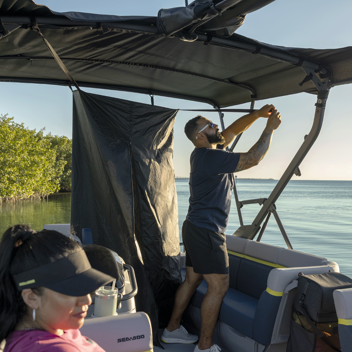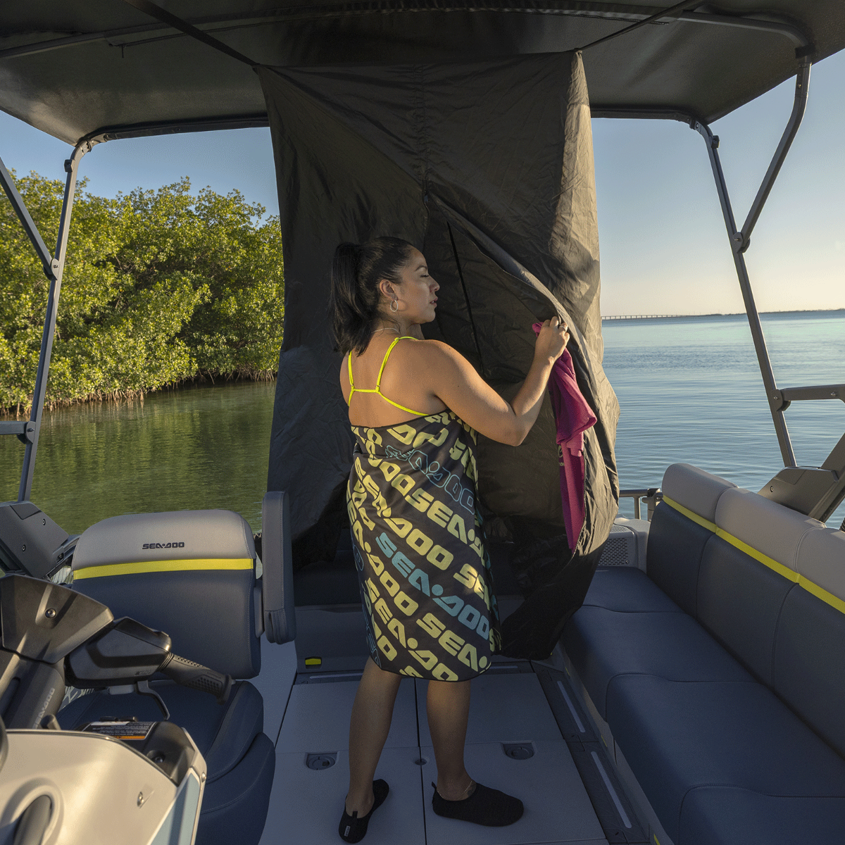 Enjoy longer days on the water with this useful new accessory. This Pop-up Changing Room and Emergency Toilet lets you change clothing or use the toilet out of sight and protected from the elements. It quickly attaches to the bimini top structure of your Switch pontoon. The kit includes a privacy curtain with a zippered opening for easy access, an emergency toilet, and a storage bag. When not in use, it stows easily in the under-seat compartments of the boat. It's an absolute must-have for your next adventure! Offers a private space to change clothes or to use the emergency toilet. Comes with a storage bag that can hold the privacy curtain and emergency toilet. Can be quickly installed to any bimini structure with simple strap attachments. Zippered opening for easy access. Dimensions once open : 30'' L x 30'' W x 80'' H (76 cm L x 76 cm W x 203 cm H). Stows easily in under-seats compartment.