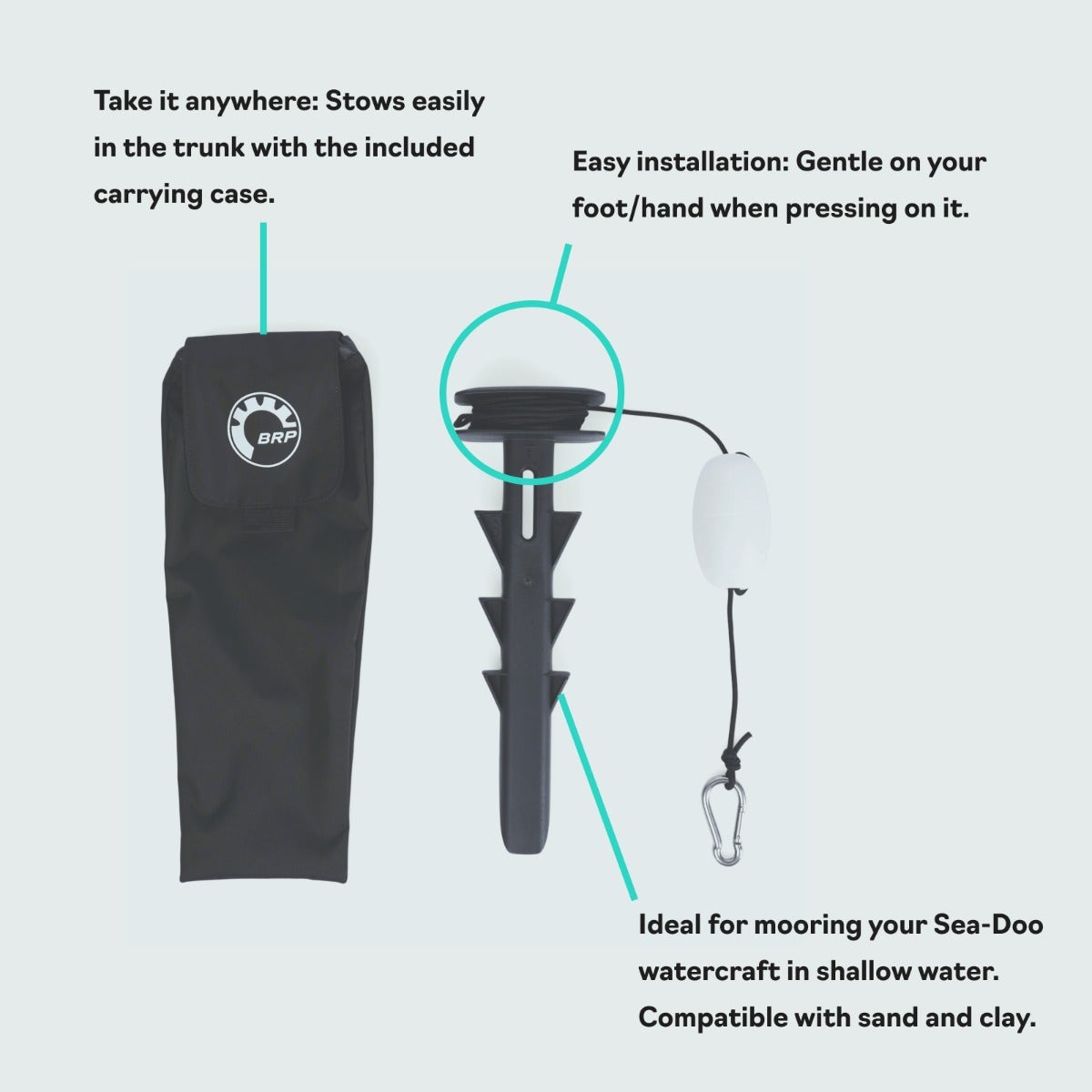 Anchor your personal watercraft close to the fun with the ultimate Sea-Doo sidekick: the Spike Anchor. Its versatile design means it can be used in sand, clay and shallow water, while its user-friendly features – like a 25 ft rope and a depth level indicator – ensure your Sea-Doo is secure while you soak up the sun. Plus, it's gentle on hands and feet, making setup a cinch. Store this Sea-Doo anchor in your PWC's front compartment and be ready for wherever the waves take you! 25 ft rope. Can be used in sand, clay and lakes. Depth level indicator on the anchor. Gentle on your foot/hand when pressing on it. Easy to use, easy to clean. Lightweight, easily fits in front storage compartment of watercraft. Portable carry bag included.