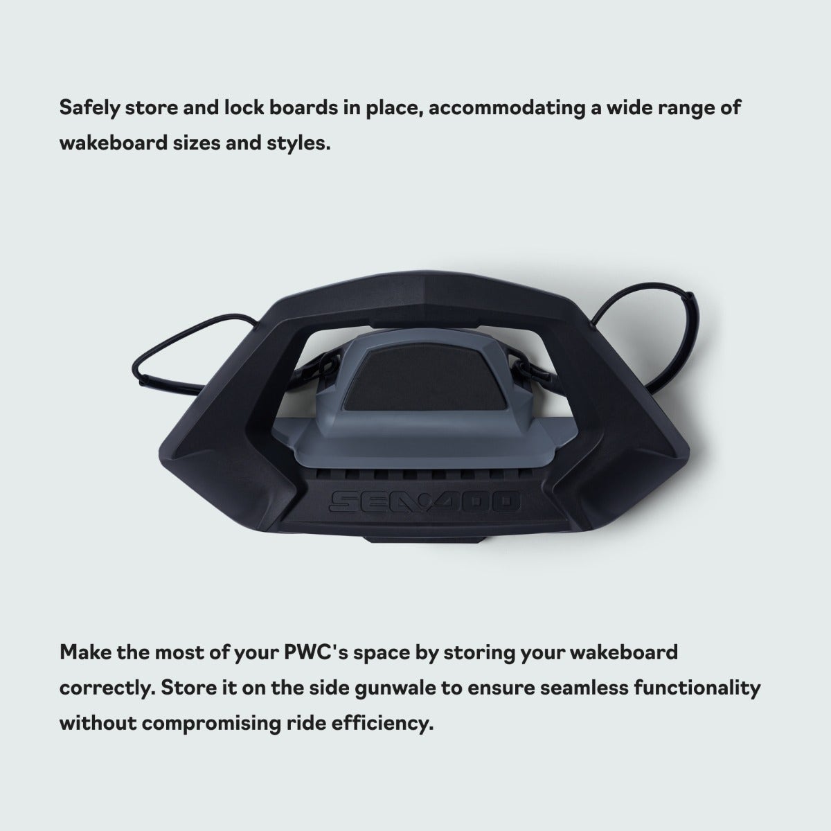 Instead of gripping onto your wakeboard, why not stash it where you can see it, then access it when you’re ready? With this personal watercraft Wakeboard Rack, which can be easily installed on the side of your ride, you can conveniently tuck in your board until you’re ready to hit the water. Made with EVA cushion, this smart design keeps the edge of your board in top shape, while its rubber-padded bungee holds the board in place while preventing wear on the cord. Best of all, it’s crafted to hold most sizes of wakeboards. Easy, safe onboard storage for your wakeboard. Convenient quick-release button for fast access. EVA foam cushion protects board edge while underway. Bungee cord with rubber pads holds board in place while preventing wear on the cord. Accommodates most sizes and styles of wakeboards and wakeskates. Sold individually, each rack holds one wakeboard. Standard on WAKE, WAKE PRO and Explorer Pro models.
