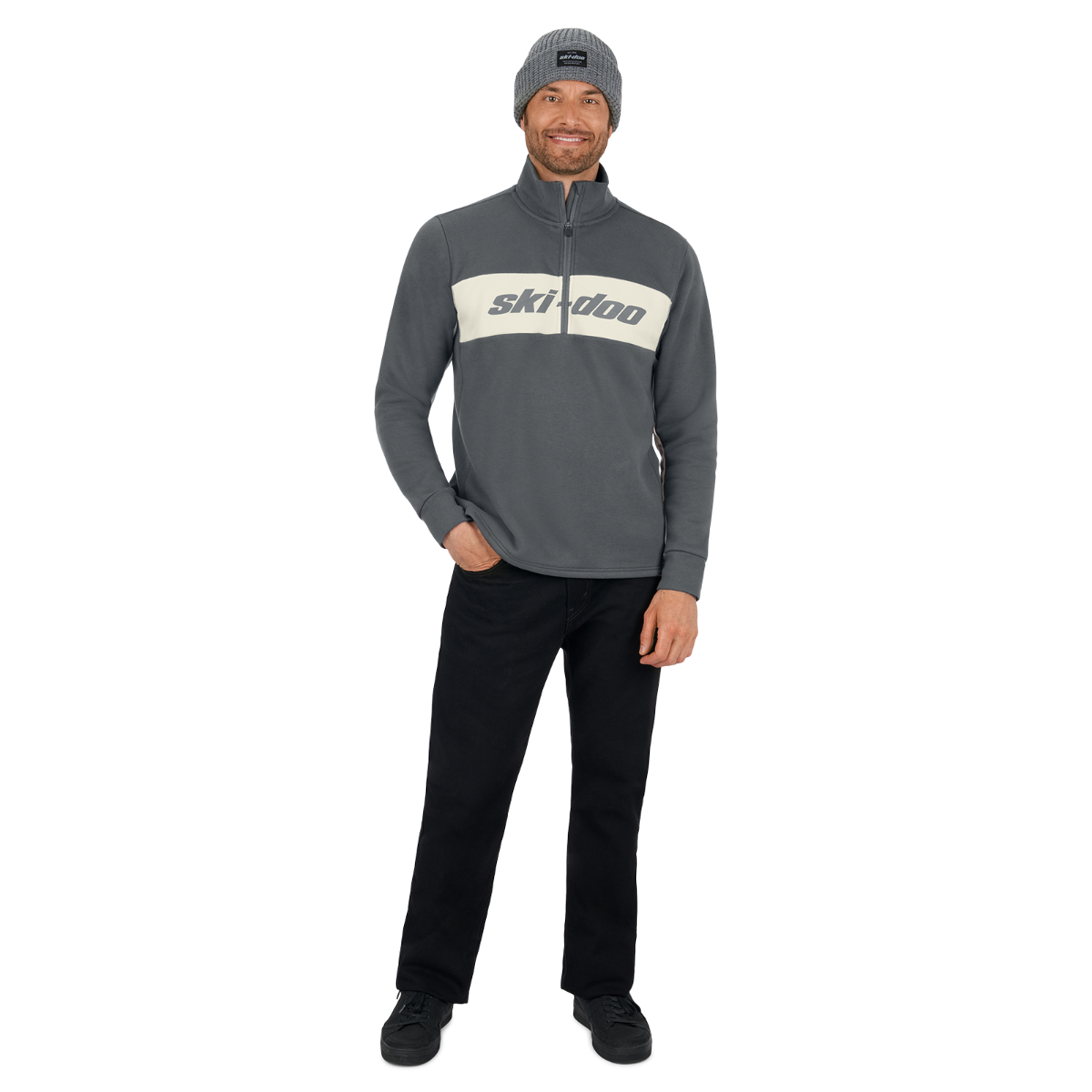 Take the trails to task without letting the cold get in your way in our  Ski-Doo Men's Heritage 1/4 Zip. A quarter-zip silhouette delivers adjustable coverage, while the heritage look is always a crowd pleaser when you take off your jacket at the post-ride dinner.
