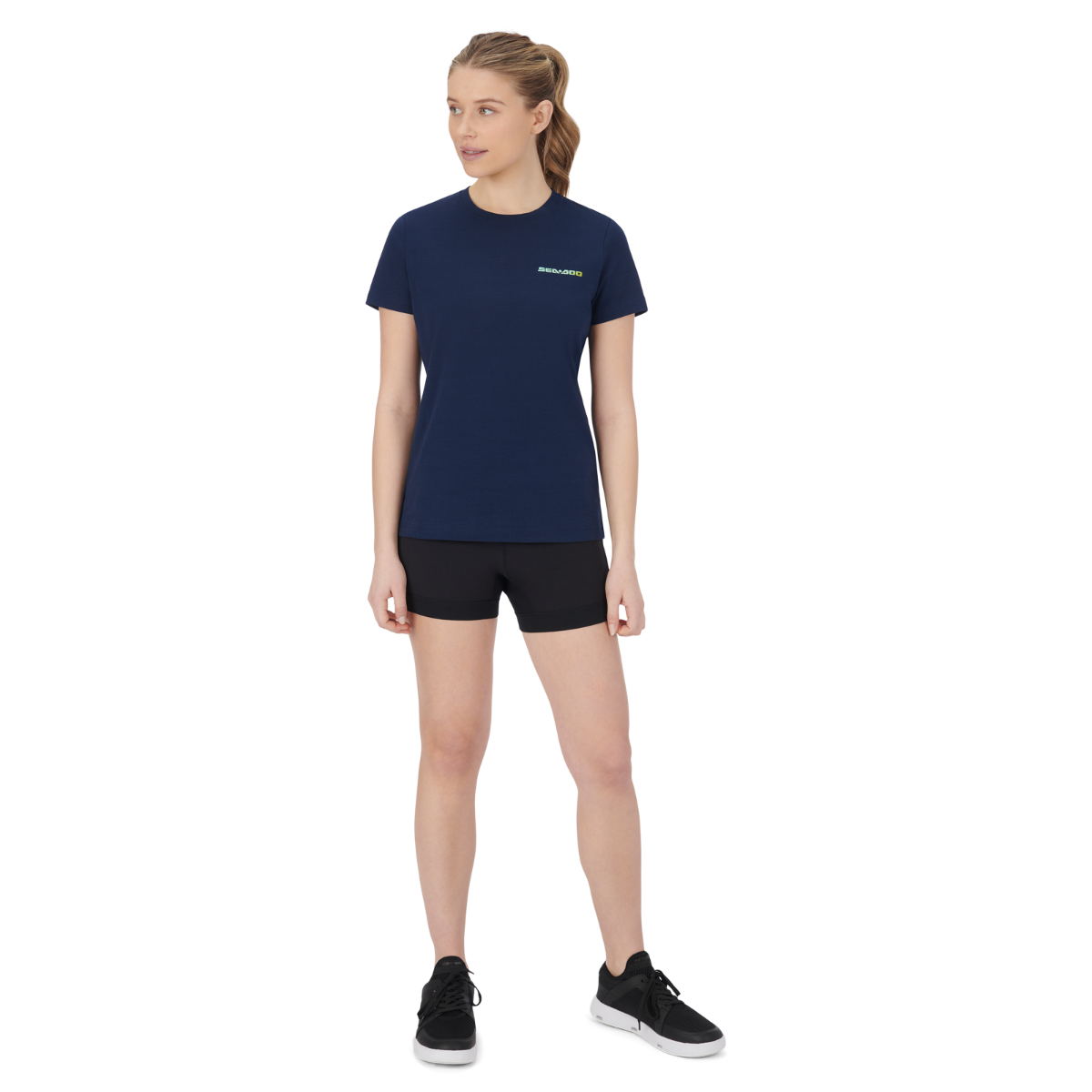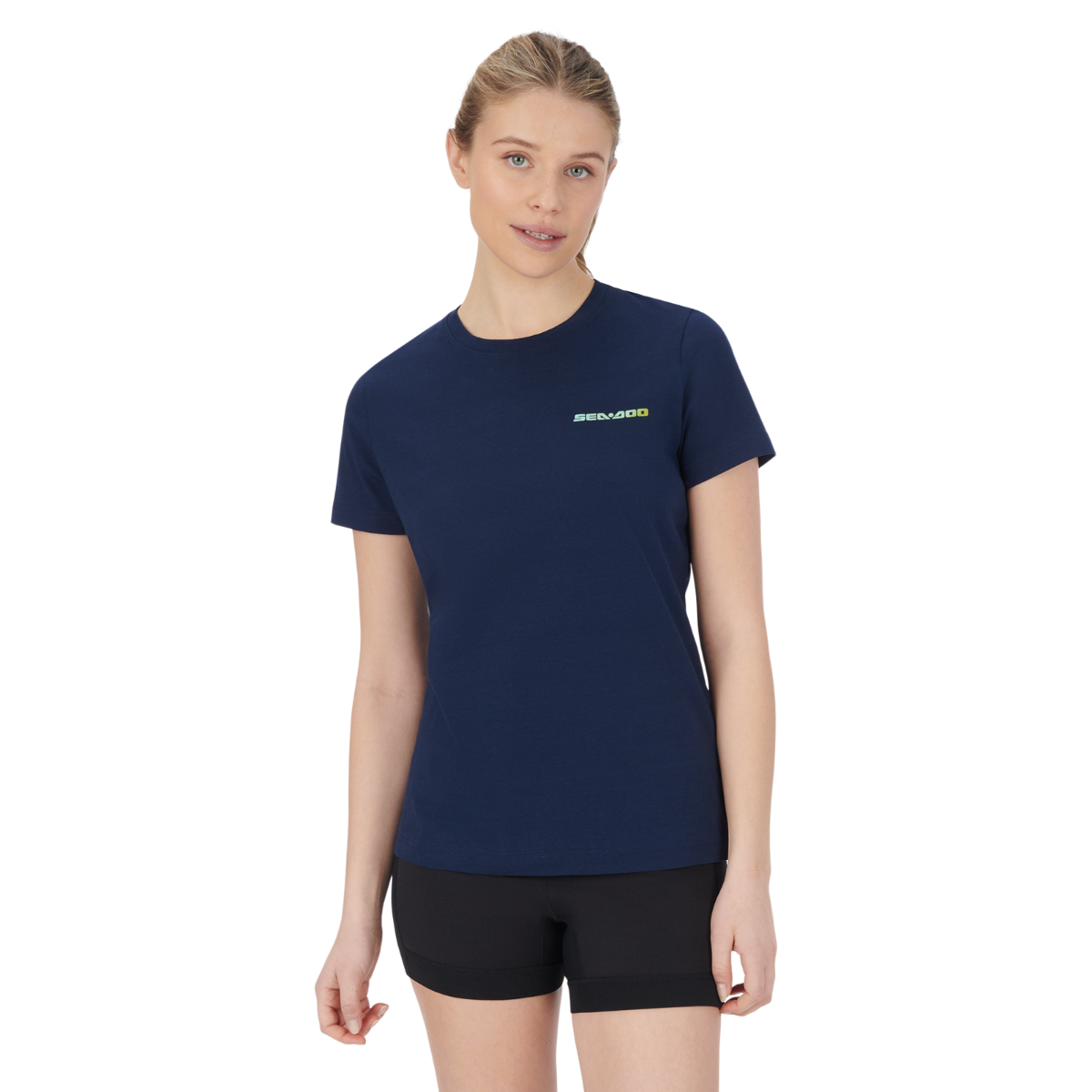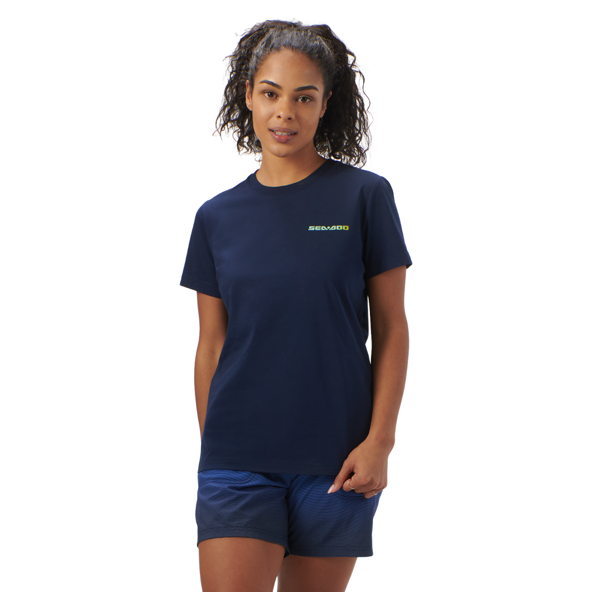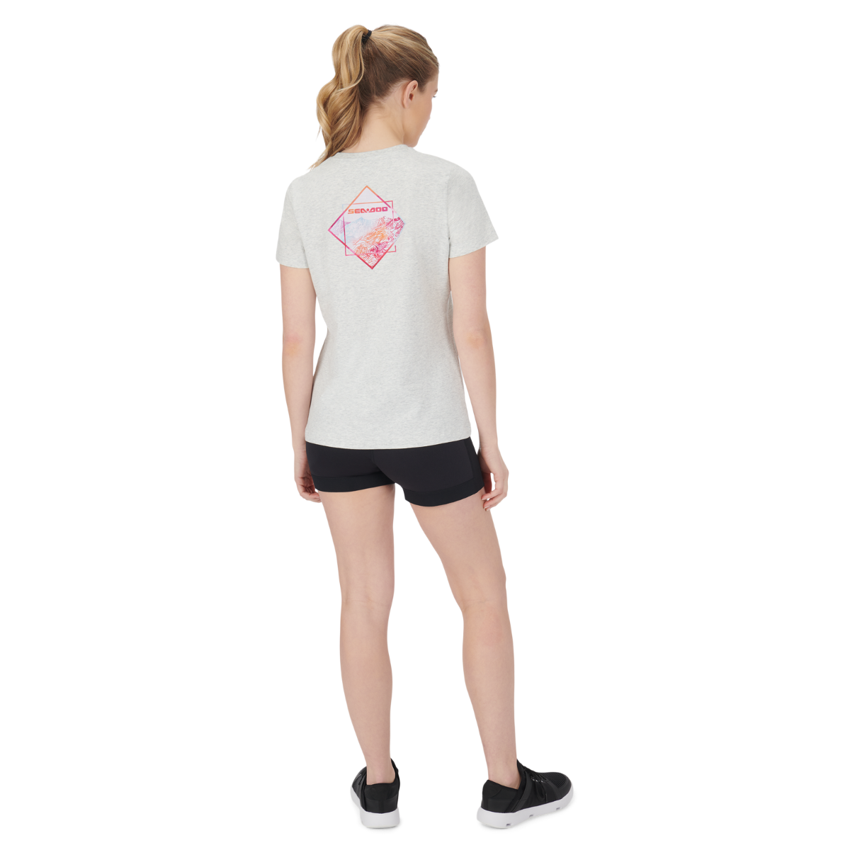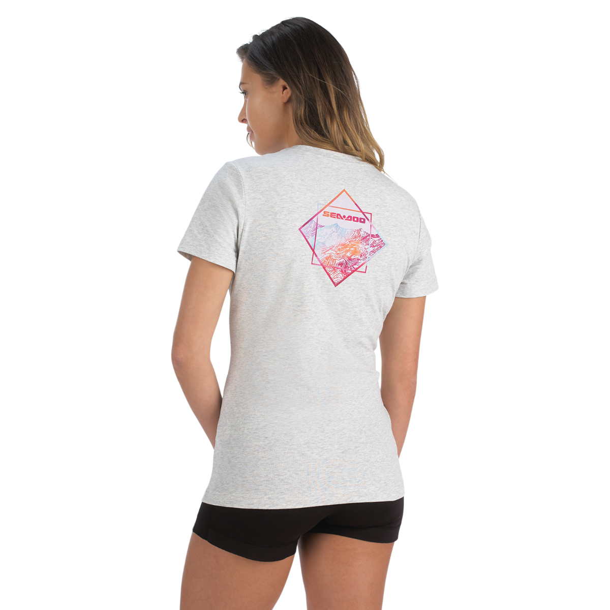 No boring white tees here! Step up your t-shirt game in the Sea-Doo Women's Sunset T-Shirt. Not your average everyday basic, this top features Sea-Doo logo branding at the chest and colorful artwork at the back. A premium blend of cotton with a touch of spandex has a luxe feel, while the ribbed collar delivers durability for daily wear. 95% Cotton, 5% Spandex. 180 gsm. Rib collar. Artwork at back. SeaDoo logo at chest.