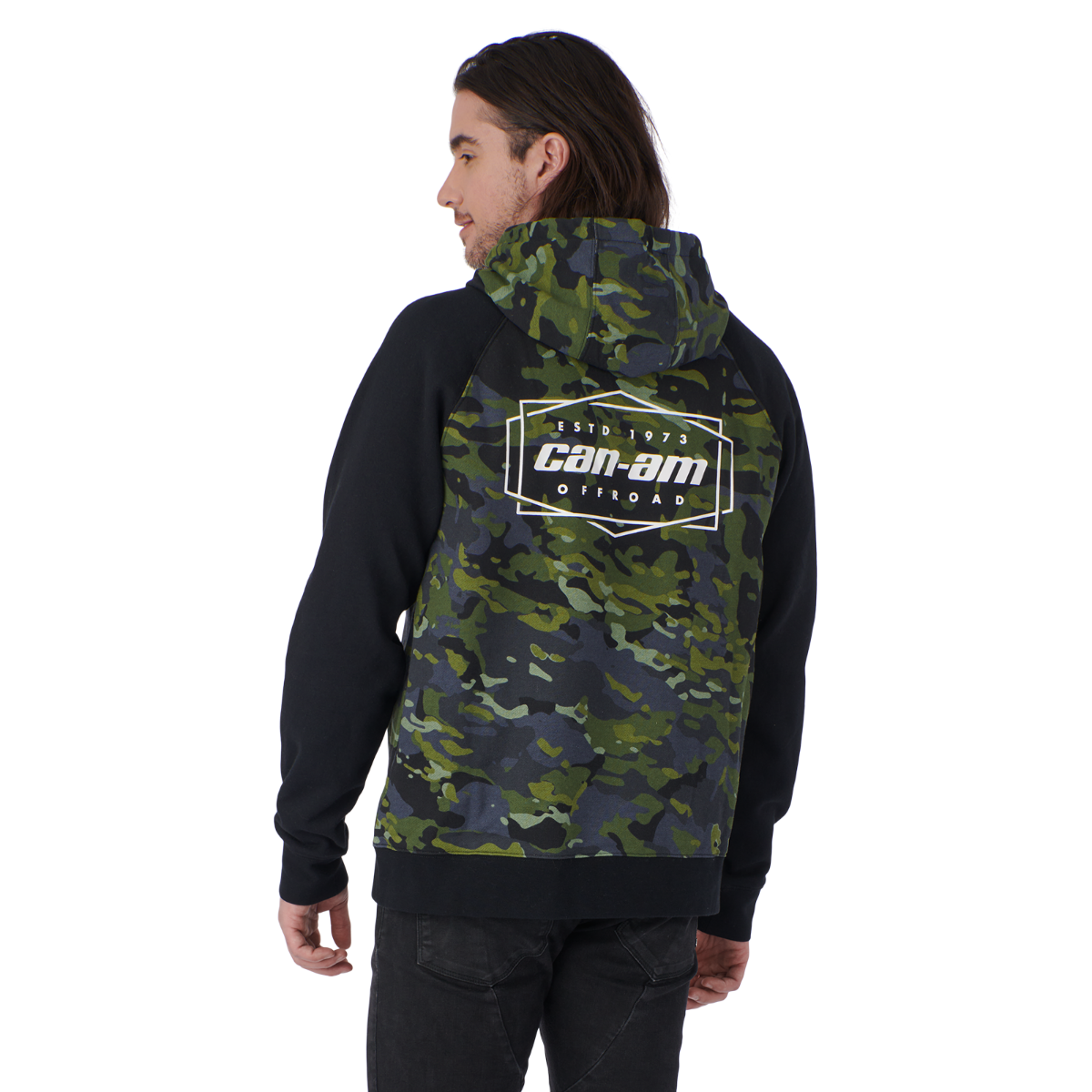 Tackle whatever the trail throws your way in style and comfort with the Men's Can-Am Premium Hoodie. The heavyweight fleece of our ATV men hoodie will have you wanting to wear it every day. With its soft yet stretchable blend of cotton, polyester and spandex, this gear has a kangaroo front pocket to secure small items as well as a knit ribbing at the cuff and bottom hem. Fix it tightly or wear it loose by adjusting the drawcord on your soft cotton hood. Not only that, it comes with a SMALL ESTD 1973 OFF-ROAD CAN-AM bold logo on the upper left corner on the front of the hoodie. Turn it around and you'll see the same one in the center on the back. 72% Cotton, 23% Polyester fleece, 5% Spandex. Fleece: 320 gms Knit ribbing at cuff and bottom hem. Drawcord adjustment at hood. Double-lined hood: 100% Cotton. Kangaroo front pocket. Small ESTD 1973 off-road Can-Am in a inter hexagon and rectangular shaped logo on the upper left front/Same logo but larger on upper centered back.