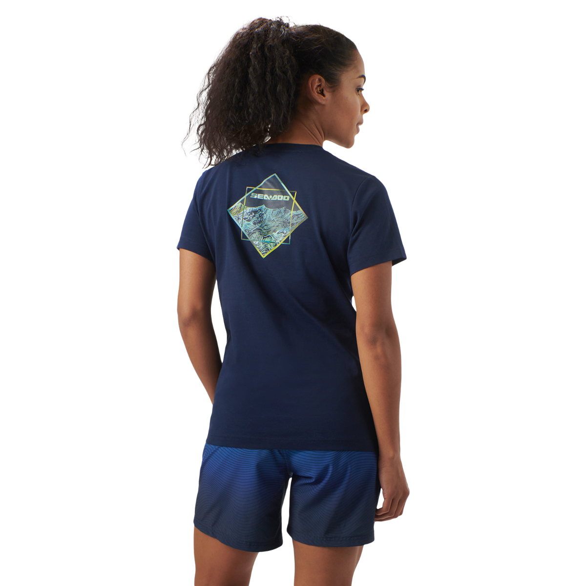 No boring white tees here! Step up your t-shirt game in the Sea-Doo Women's Sunset T-Shirt. Not your average everyday basic, this top features Sea-Doo logo branding at the chest and colorful artwork at the back. A premium blend of cotton with a touch of spandex has a luxe feel, while the ribbed collar delivers durability for daily wear. 95% Cotton, 5% Spandex. 180 gsm. Rib collar. Artwork at back. SeaDoo logo at chest.
