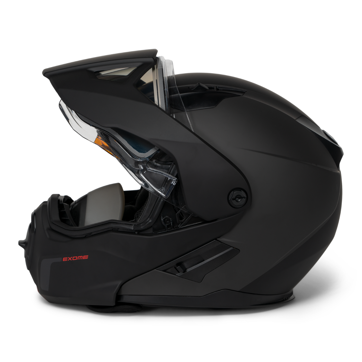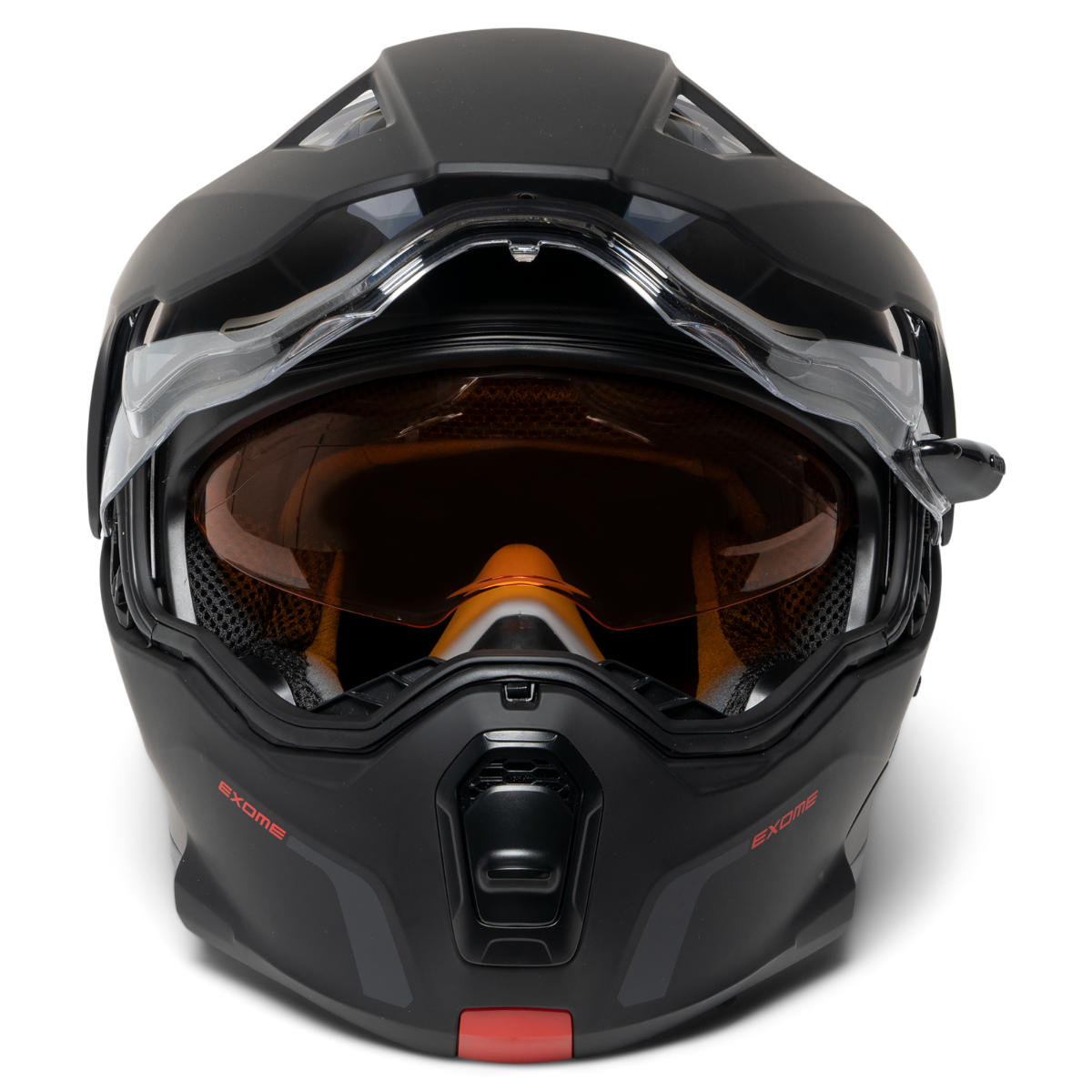 Rugged outdoor looks and high-tech protection combine in the Ski-Doo Exome Sport Helmet, a DOT-certified helmet that’ll keep you feeling confident and safe. A dual-lens anti-fog visor and Breath Evac fog-resistant mask system ensure your line of sight remains clear no matter what, while the fit is eyeglass-friendly. Those enhancements are standouts in a modular helmet that boasts an advanced plastic composite shell, a removable peak and a quick-release chin strap to accommodate easy on/off. Technology & Features Breath Evac System: Fog-resistant breathguard mask system. Vision & Eyewear Compatibility Field of Vision: Wide, unobstructed view. Visor: Dual lens anti-fog visor. Amber sun visor included for optimal vision in snowy conditions. Tinted and retractable sun visor. Eyewear: Compatible with prescription glasses. Lighting & Safety Certification: DOT approved. Environmental & Ergonomic Design Shell: Advanced Plastic shell for durability and minimal environmental impact. Fit & Sizing Fit: Helmet should be snug; it will break in and loosen slightly over time. Shell Sizes: Two shell sizes for optimal fit and comfort. Accessories: Includes 5 absorbent pads for the Breath Evac mask. Chin Strap: Quick-release system. Warranty Coverage: 4-year limited warranty.